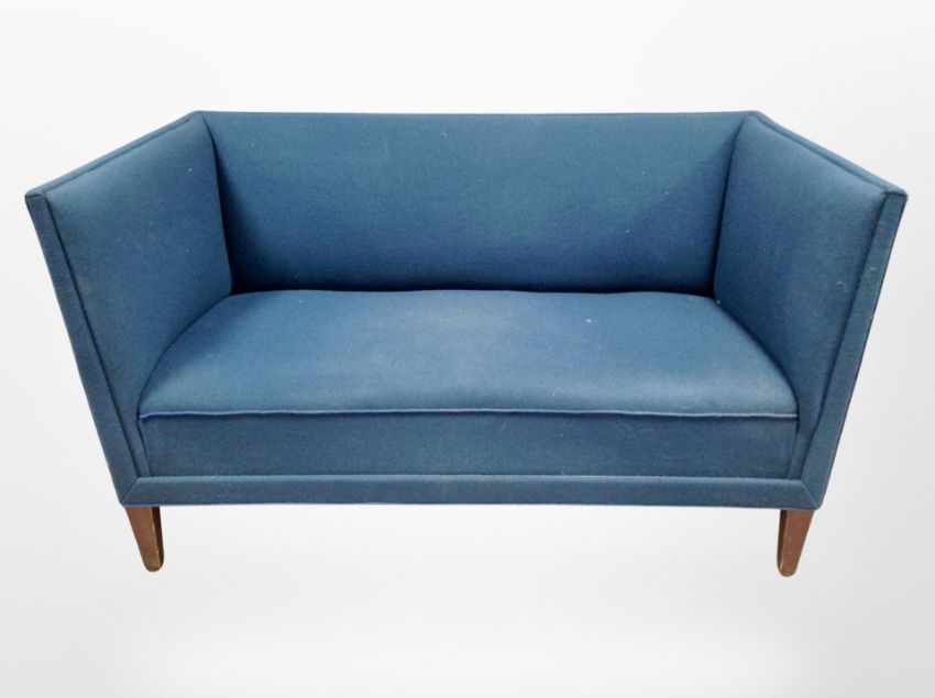 A 20th century Danish two seater salon settee in blue upholstery, width 133 cm
