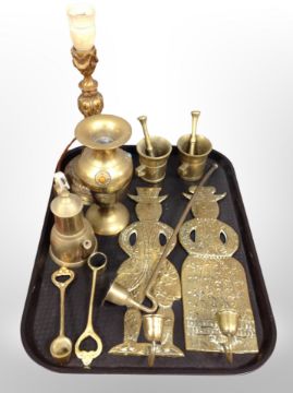 A group of brass ware, pair of figural candle wall sconces, pestles and mortars, vase, ornate lamp base