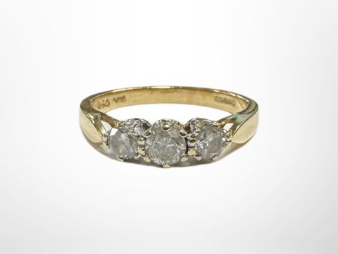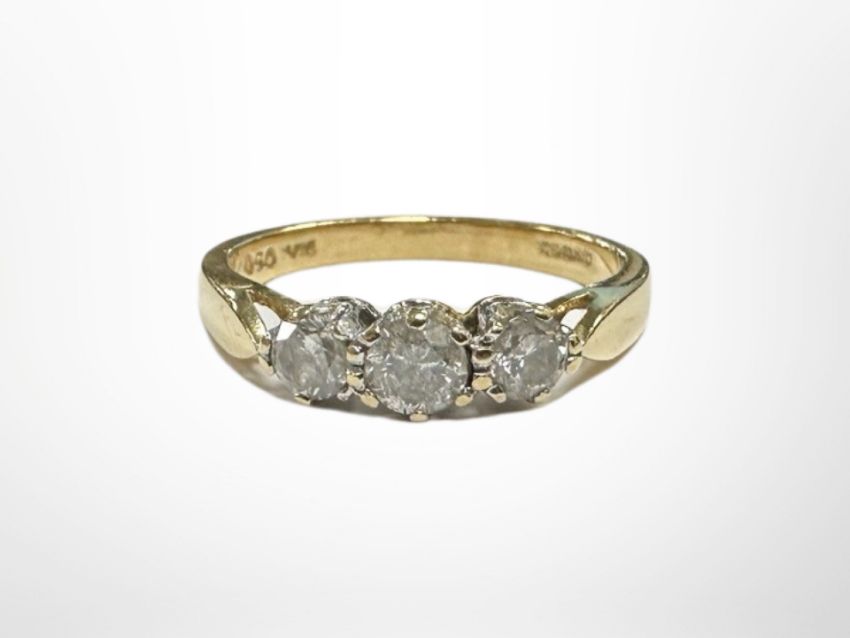 An 18ct gold three stone diamond ring, size L.