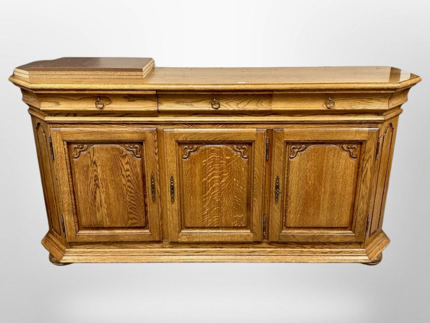 A carved oak sideboard, fitted cupboards and drawers beneath, length 203 cm