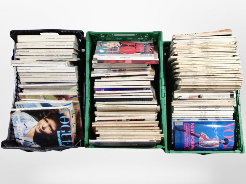Three crates containing vintage Vogue magazines