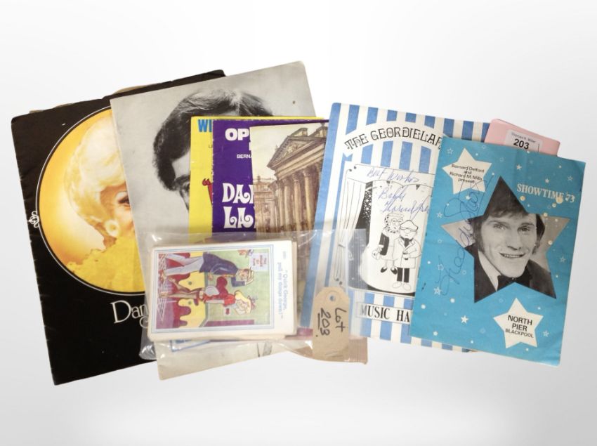 A Showtime Blackpool 1973 programme, signed by Freddie Starr, Paul Melba and Dave Arnold, together with a Larry Grayson programme, A Geordielanders Music Hall programme, signed by Bobby Thompson (The Little Waster) and Elanoer Martin, two Danny La Rue programmes, a "Love Thy Neighbour" theatre programme, approximately twenty five humorous postcards, etc. (Q)