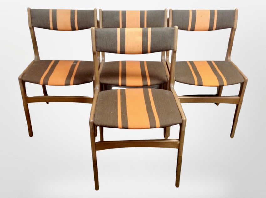 Four 20th century Danish teak dining chairs in striped upholstery