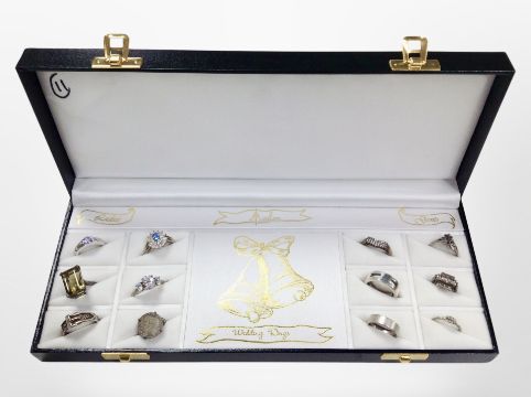A display case containing 12 silver dress rings.