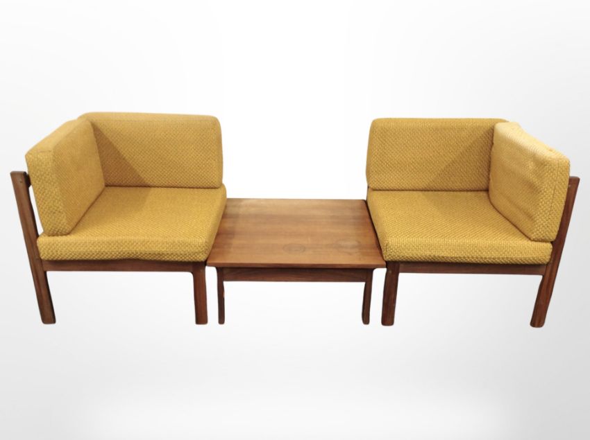 A 1970's Danish teak framed three piece conversation settee, comprising of two armchairs in Ochre upholstery and central square low coffee table, 195 cm wide x 67 cm deep x 72 cm high