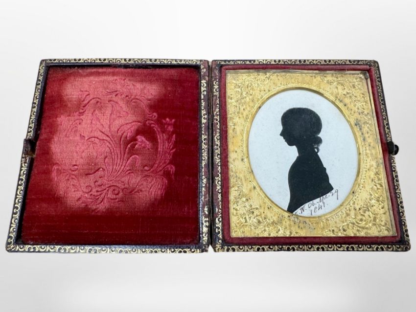 An early Victorian silhouette portrait in tooled leather case, dated 1841.