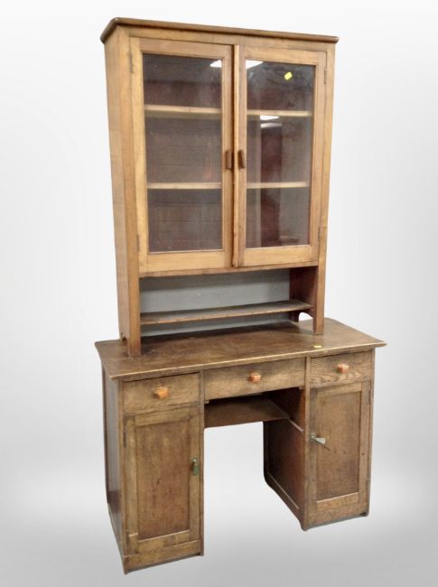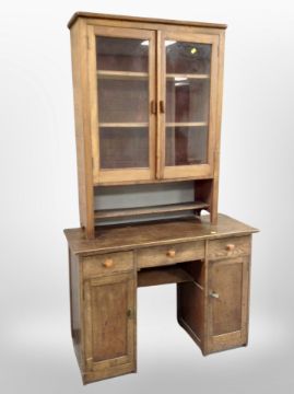 An Edwardian oak twin pedestal desk and a glazed bookcase