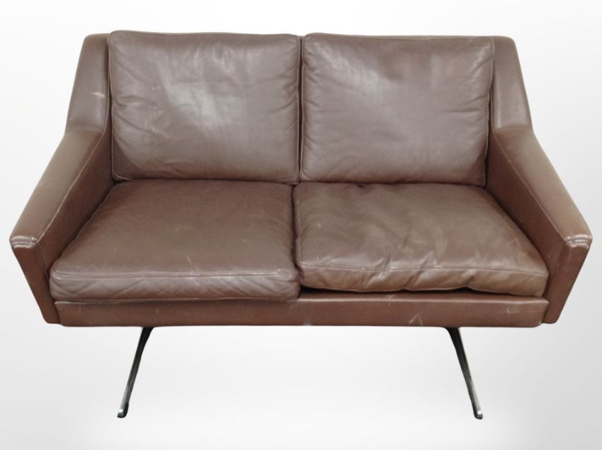 A late 20th century Danish brown leather two seater settee, on chrome supports, width 133 cm