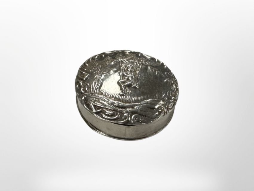 A small circular embossed silver pillbox, diameter 3.5 cm.