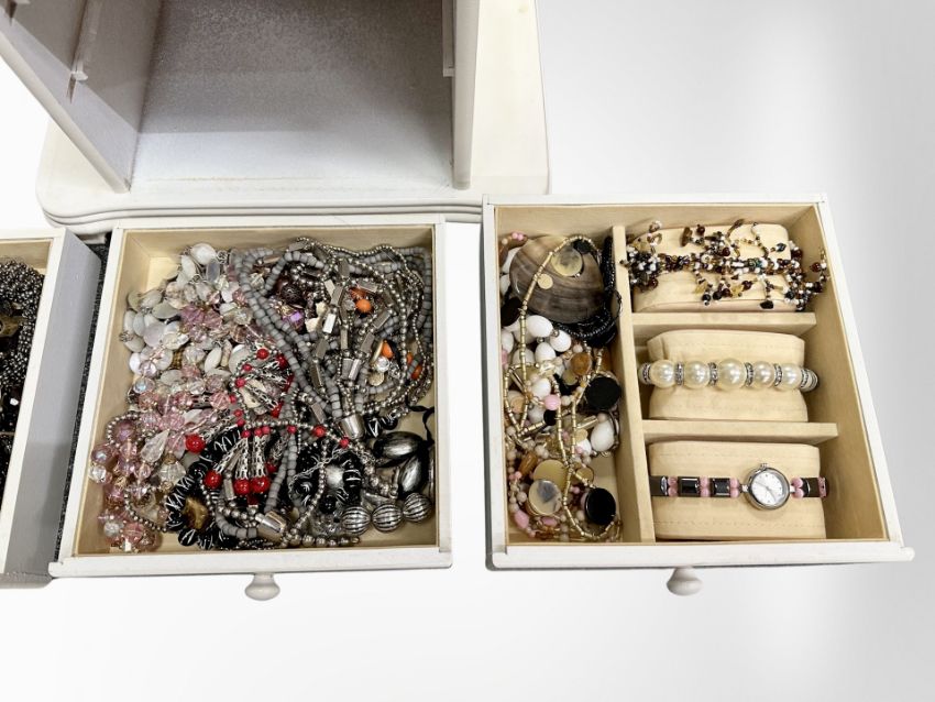 A contemporary jewellery box and contents to include lady's wristwatch, costume jewellery, dress rings, faux pearls, etc.