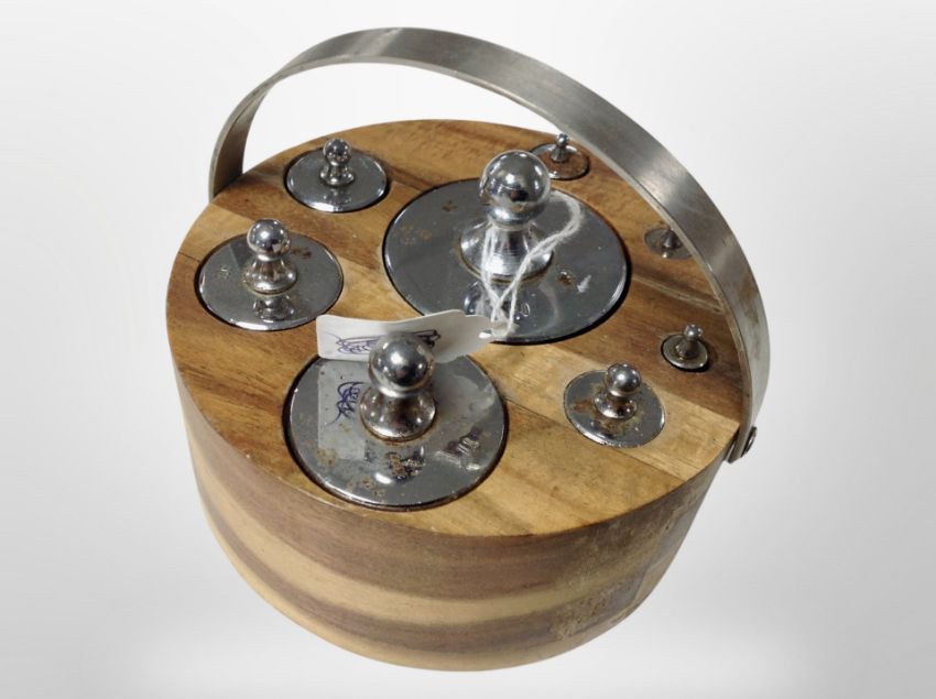 A circular wooden stand containing a set of graduated chrome weights ranging from 2lb to a 1/4oz.