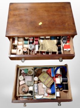 A Victorian three drawer chest with glass handles containing assorted spools of thread
