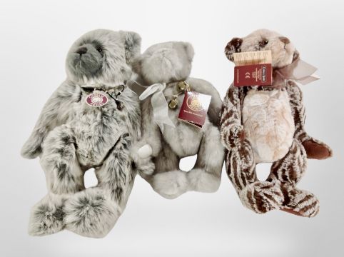 Three Charlie bears, Alan, Icicle, and Joey, with tags.