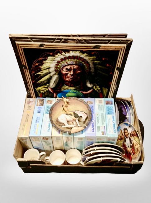 A box of Native American pictures, collectors plates, and puzzles.