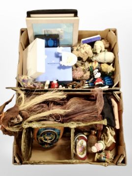Two boxes of brass, two tier plant stand, figures, Wedgwood ceramics