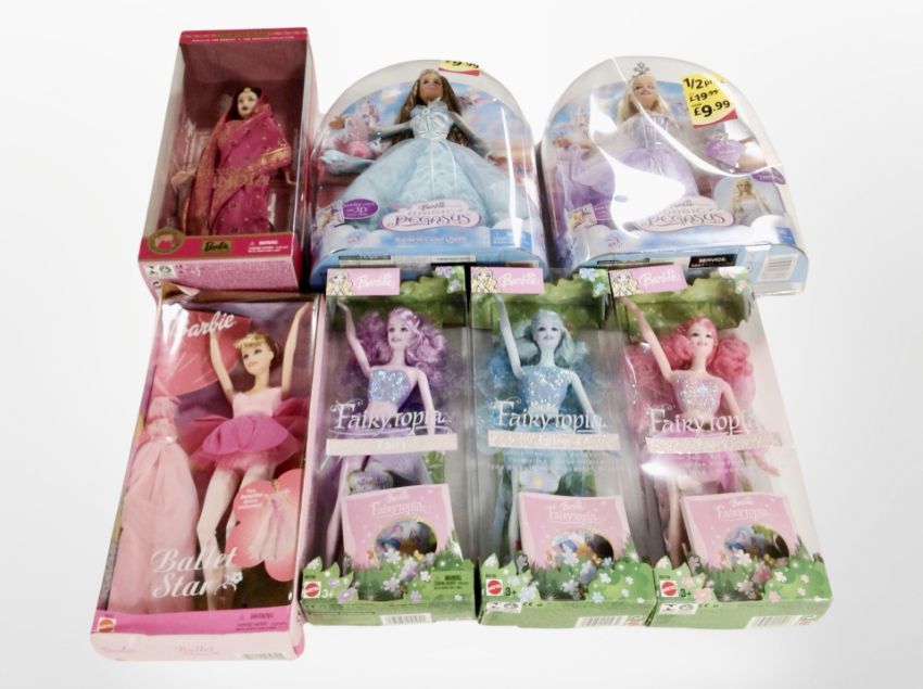 A group of boxed Barbie dolls including Princess of India, Ballet Star, Fairy, etc.