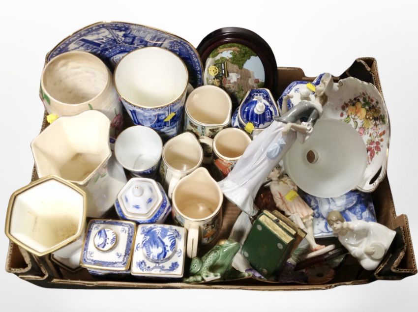 A box of Maling lustre ceramics, Ringtons china, Nao figures, Wedgwood etc