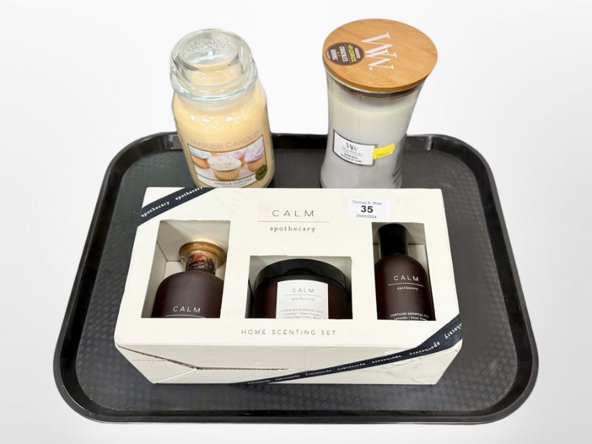 A WoodWicks warm wool candle together with Yankee Candle Vanilla cupcake and a Calm Apothecary home scent set.