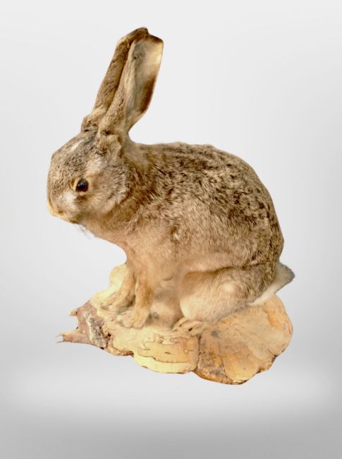 A taxidermy rabbit on naturalistic wooden plinth, height 44 cm
