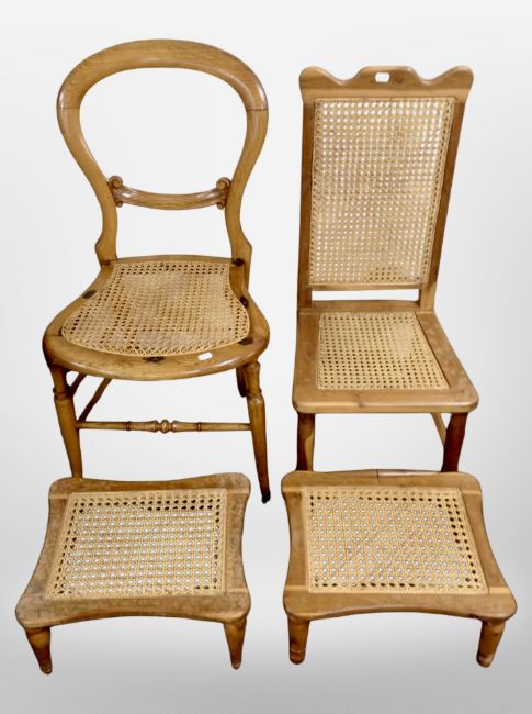 Two cane seated chairs and a pair of stools