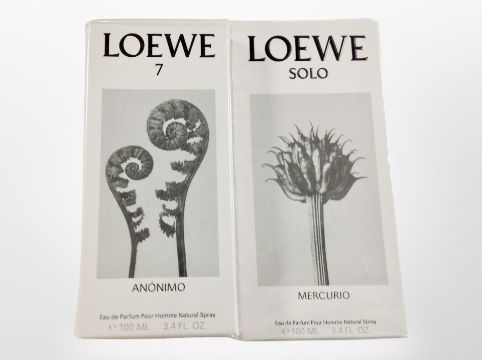 Two bottles of Loewe Anonimo and Mercurio eau de parfum pour homme natural spray each 100ml, sealed in retail cellophane.
