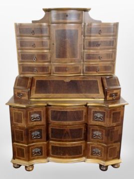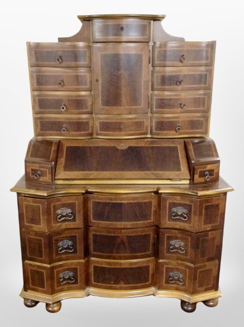 A reproduction continental inlaid satin wood secreataire bureau, width 131 cm