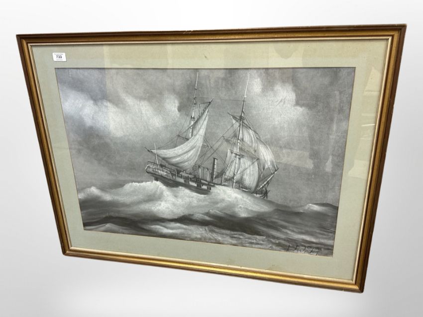 P J Wintrip : The USS Constitution in rough seas, colour chalks, 76 cm x 51 cm
