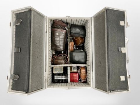 A metal case of camera equipment and cameras including Rollei and Zeiss etc