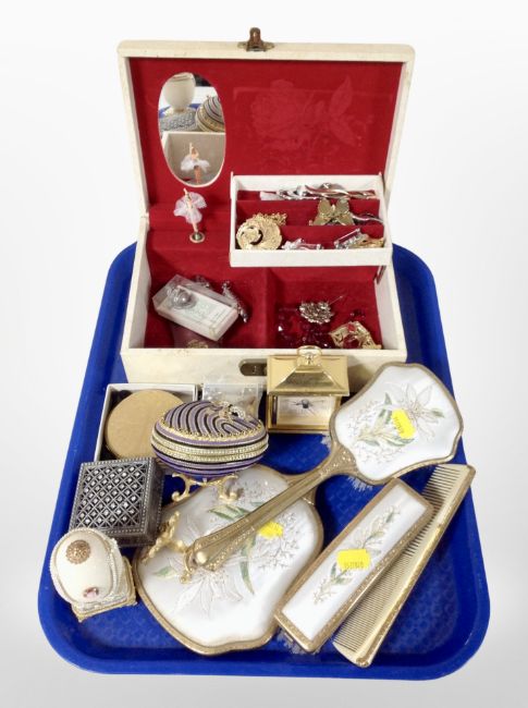 Jewellery box and assorted costume jewellery, dressing table brush set, trinket boxes and compacts