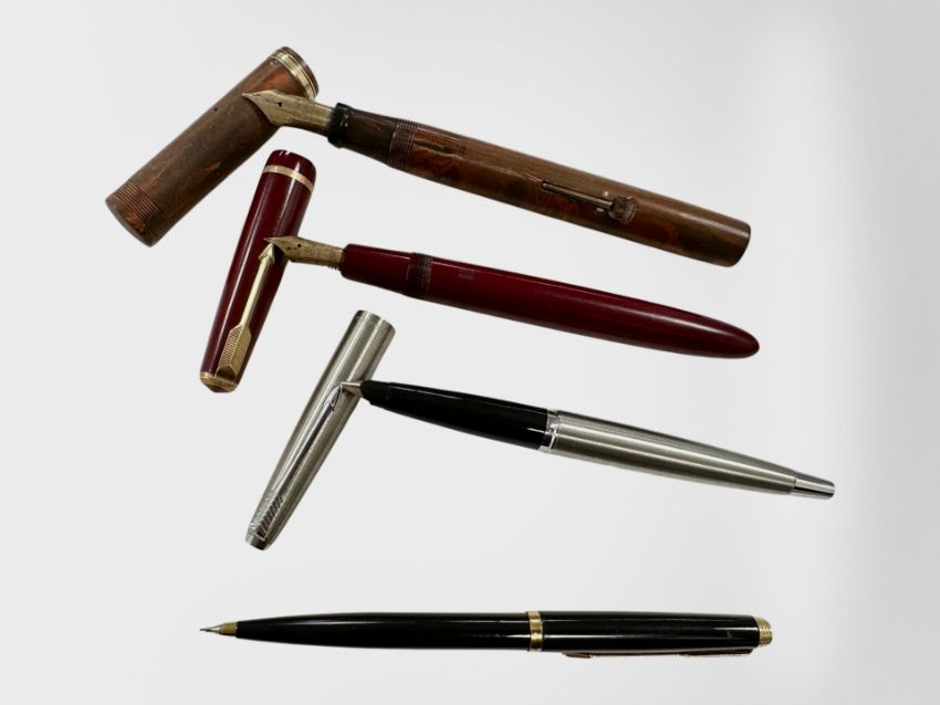 A Conway Stewart fountain pen with 14ct gold nib and similar Parker fountain pen (both with damaged cases) together with a further Parker example with yellow metal (presumed gold) nib and a Parker propelling pencil. (4)