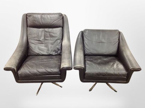 A late 20th century Danish black stitched leather swivel armchair on chrome support and further matching low swivel armchair (2)