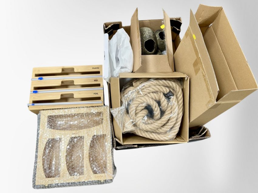 A box of new retail stock items - kitchen rack, ceramic ornament, light etc