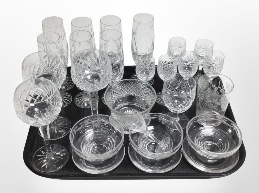 A set of 7 crystal champagne flutes, further drinking glasses, etched grapefruit bowls.