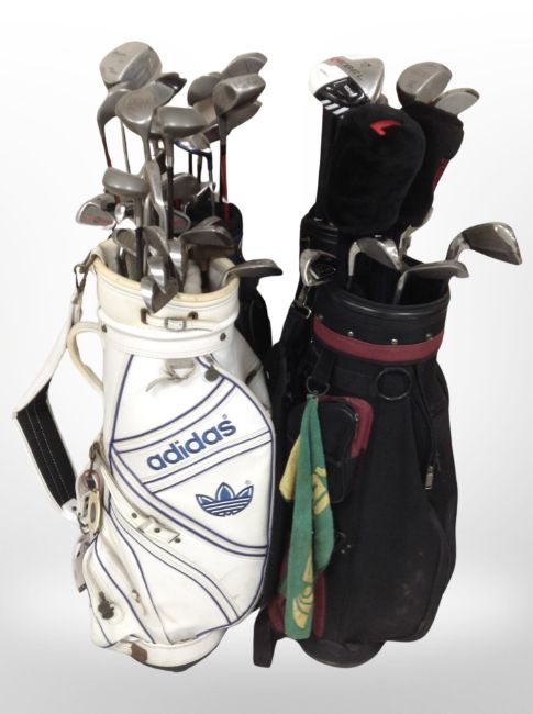 Several golf bags containing assorted drivers and irons including Dunlop, Howson, Regal etc