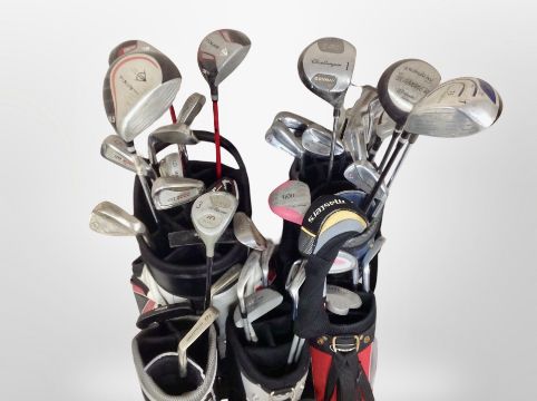 Several golf bags containing assorted drivers and irons including Donnay, Masters, Dunlop