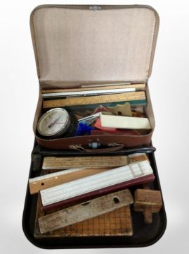 A group of vintage rulers, brass-mounted spirit level by Rabone and Sons, hydrometer, paper guillotine, etc.