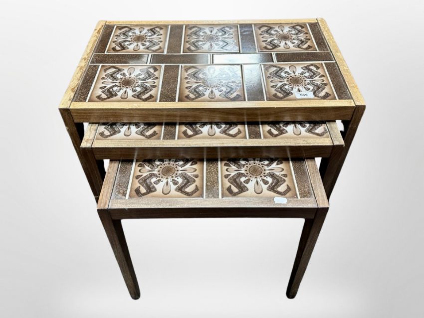 A 1970's Danish teak nest of three tile inset tables, width 64 cm