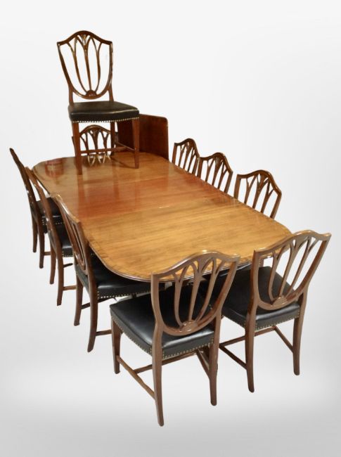 A reproduction mahogany extending dining table with two leaves, total length 265 cm together with ten mahogany and black vinyl dining chairs