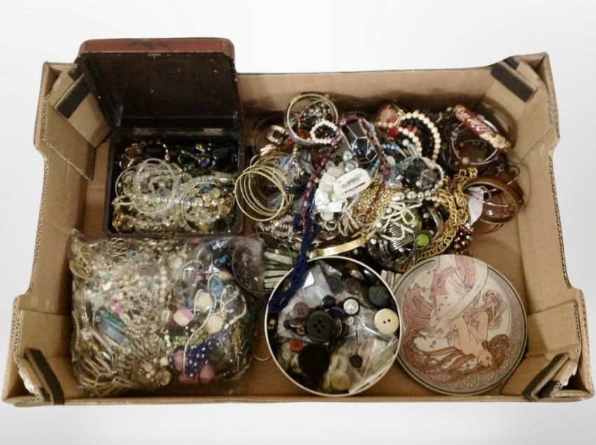 A box containing Japanese lacquer jewellery box, costume jewellery, bangles, bead necklaces, quantity of buttons.