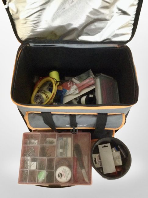 An Imax canvas fishing bag and contents to include spools of line, hooks, tools, etc.