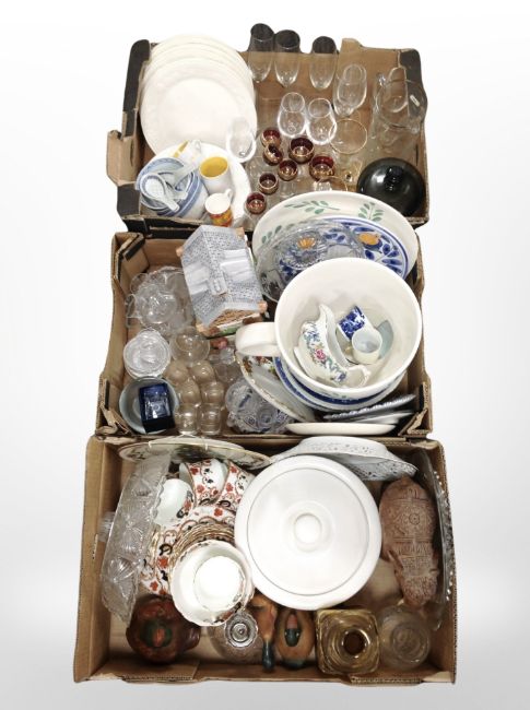 Three boxes containing drinking glasses, Imari tea china, oriental export bowls, biscuit pot in the form of a cottage, etc.