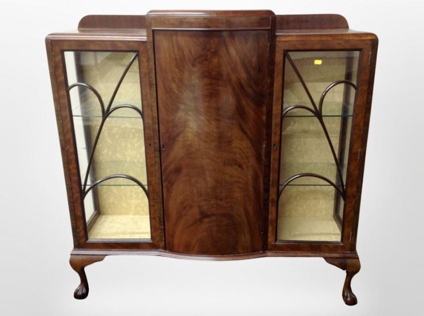 A 1920s mahogany bow front display cabinet on claw and ball feet, width 122cm.