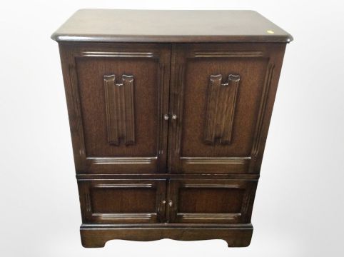 A reproduction oak linen fold double door cabinet, width 78 cm