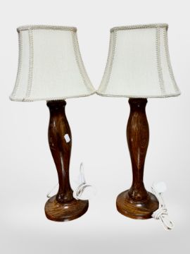 A pair of contemporary turned beech table lamps, with shades, height 52 cm
