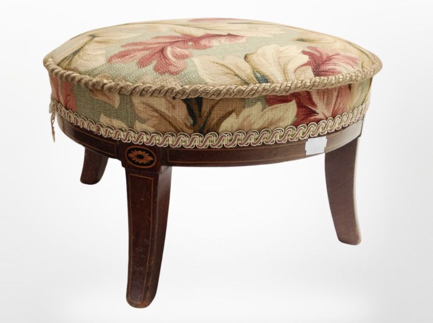 An early 20th century satin wood and inlaid circular footstool, diameter 30 cm