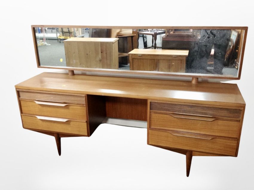 A White & Newton teak kneehole mirror back dressing table, fitted four drawers, 168 cm x 41 cm x 103 cm