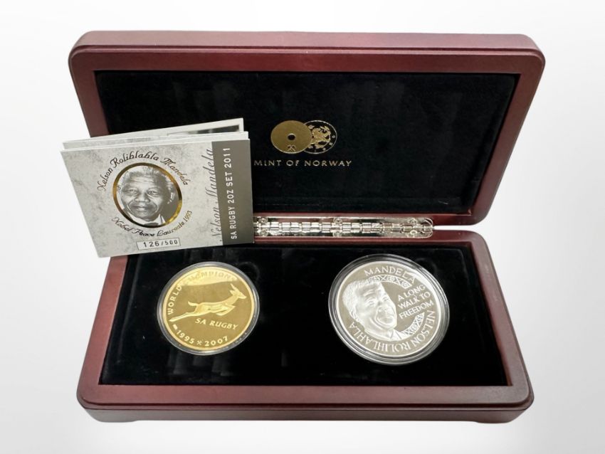 Mint of Norway - Nelson Mandela South Africa Rugby 2 oz set 2011, comprising of 2 oz 24ct gold medal and 2 oz Sterling silver medal, in presentation box with limited edition 126/500 certificate card.