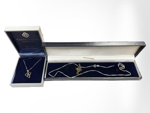 A silver necklace, an amber-set pendant and a silver Celtic design pedant on chain.