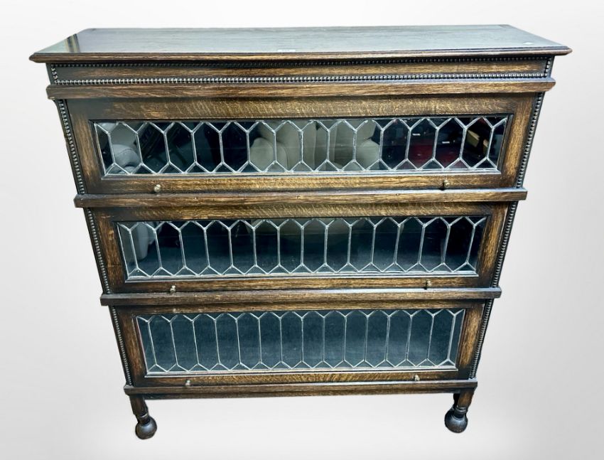 An Edwardian oak and leaded glass three tier stacking bookcase in the style of Globe-Wernicke, 115 cm x 33 cm x 129 cm