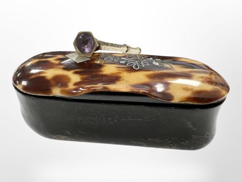 A Victorian propelling pencil with simulated amethyst finial and a horn and tortoiseshell snuff box.